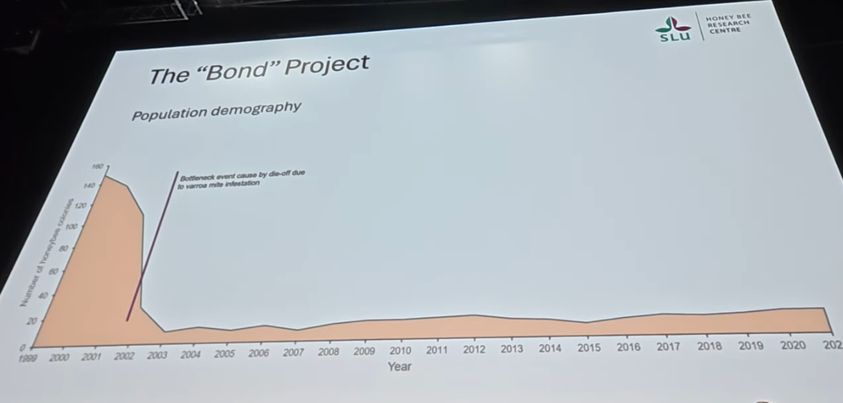 One of the more controversial but fascinating highlights at Apimondia was the 25-year report on the BOND Project on Gotland, presented by Dr. Barbara Locke from Uppsala. The core of the BOND experiment: take a large starting population of honeybee colonies heavily infested with varroa, then withdraw human interventions — no mite treatments, no swarm prevention, no feeding, no queen replacement. Let natural selection sort it out — hence the “Live and Let Die” ethos.
