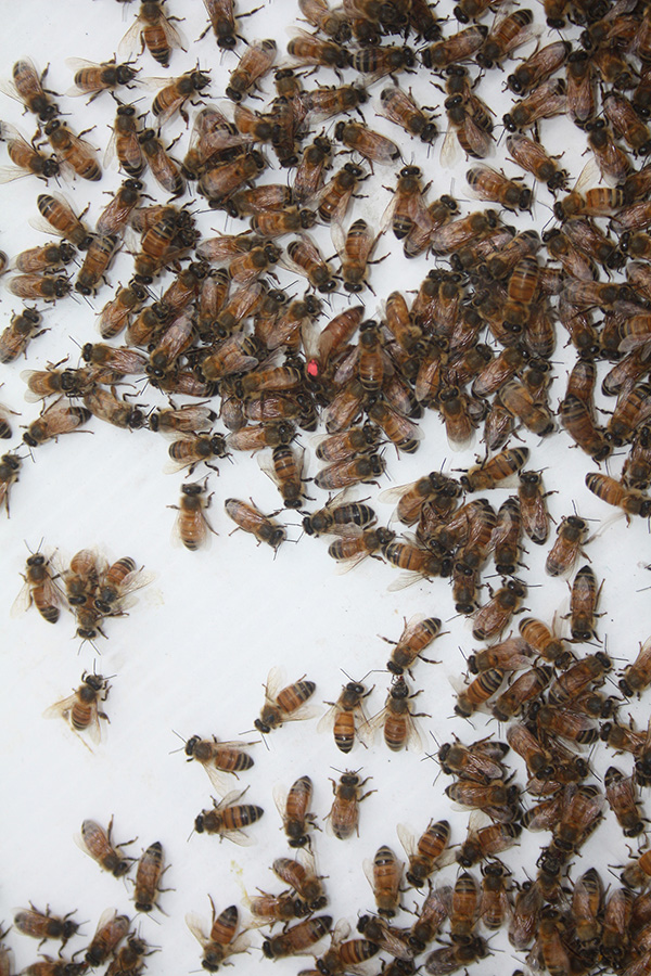 Marking the queen on the thorax helps find her using a Poska Pen available from some beekeeping supply outlets, office works or news agents.