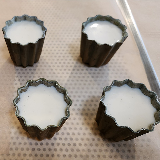 When baked, the beeswax helps the exterior form a thin, shiny, almost lacquered shell, in sharp contrast to the tender, almost pudding-like interior. While modern recipes sometimes substitute other fats for convenience, purists insist that only beeswax gives a true canelé its distinctive texture and beautiful sheen.