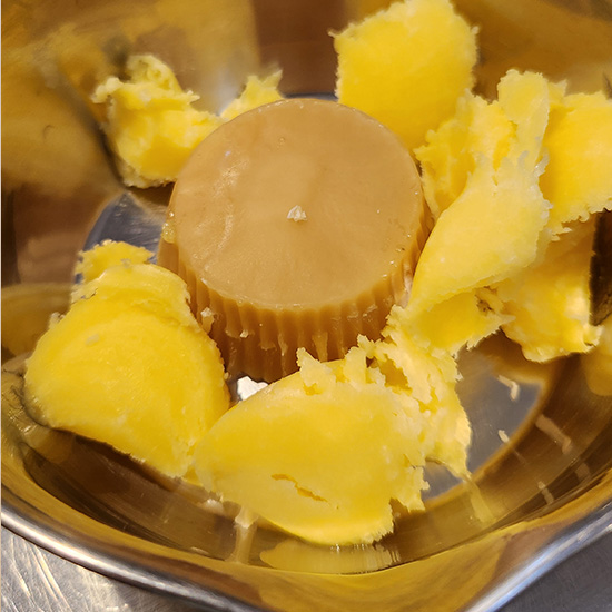Ghee (clarified butter) and Beeswax are melted in a pan