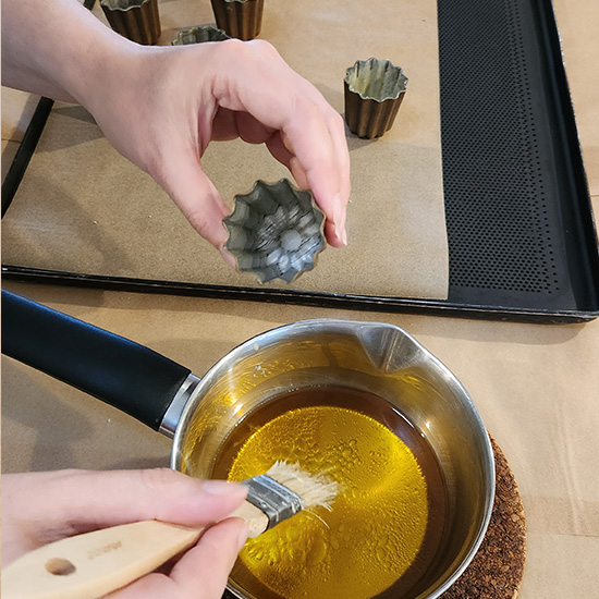 The melted ghee and beeswax is brushed into the fluted canelé molds.