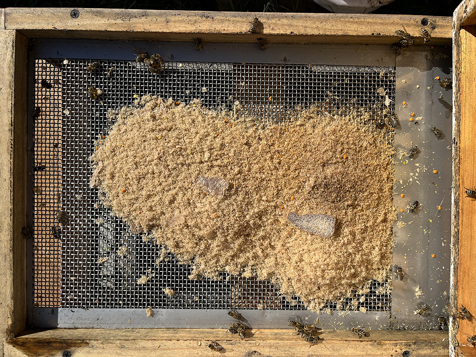 Figure 9. Chewed strip debris on ventilated bottom board on 20 July 2025
