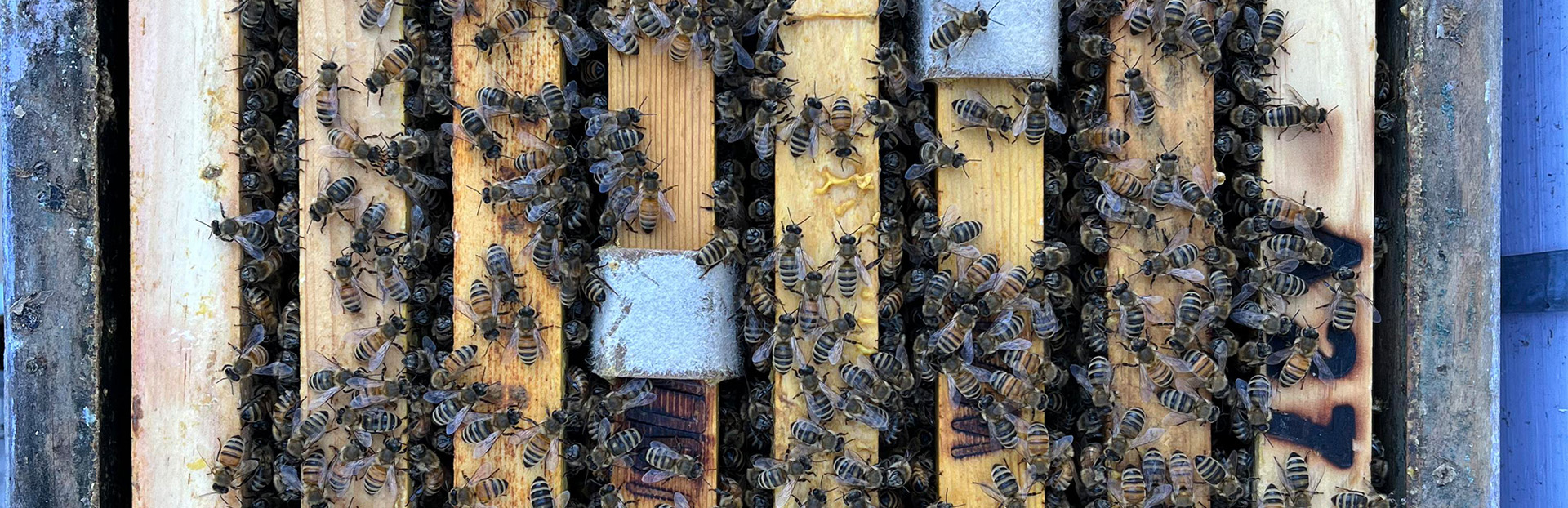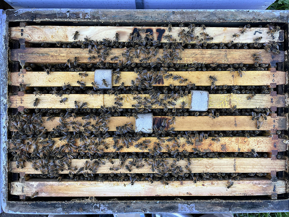 Figure 6. Chew-happy Hive 1 at 21 June 2025, 1 week after oxalic acid strips placed within the hive. By 20 July 2025 the only strip pieces left were a small square piece on the top bar.