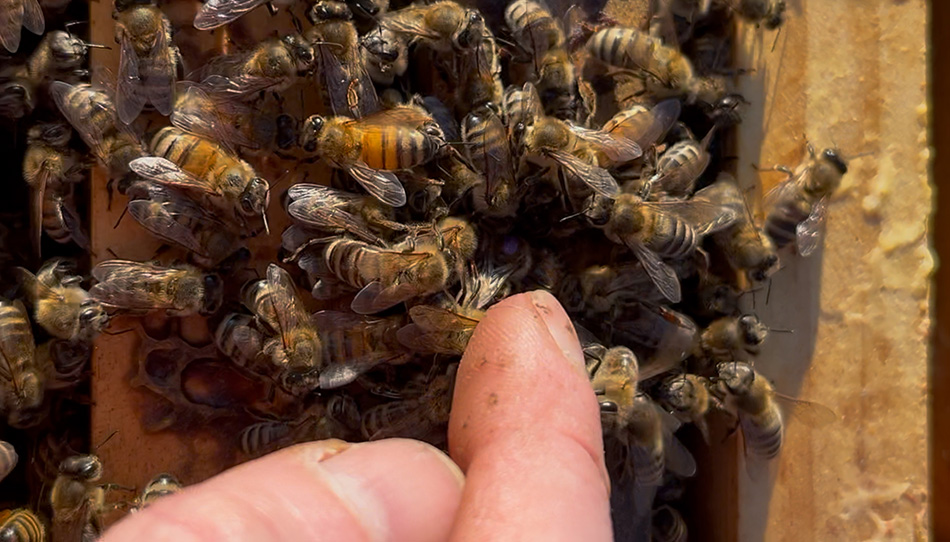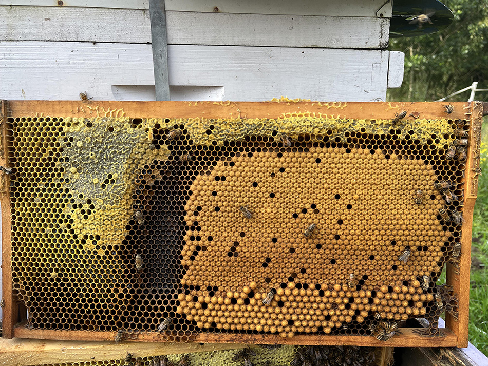 Figure 7. Hive 1 brood at 28 June 2025. Note they've removed brood behind the strip and this Carniolan queen is full speed ahead laying drones in Hunter Valley NSW winter.